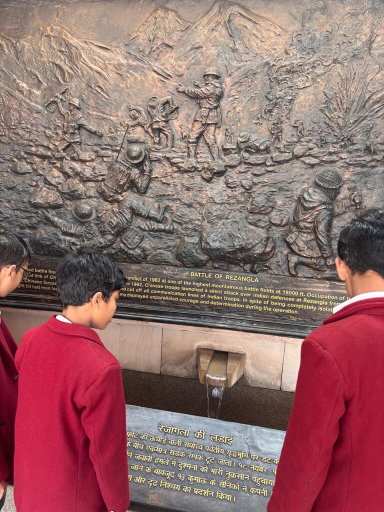 At the National War Memorial, students were deeply impressed by its circular design, which gently guides visitors towards the Amar Chakra, where the eternal flame burns in honour of the fallen heroes. As they walked through the memorial, they observed the Veerta Chakra, which displays bronze murals depicting acts of bravery. These murals portray significant battles and operations such as the Battle of Gangasagar, the Battle of Longewala, and Operation Trident, helping students understand India’s military valour through visual storytelling. The thoughtfully designed memorial, conceptualised by the renowned sculptor Shri Ram Sutar Ji, left the students filled with pride and respect.